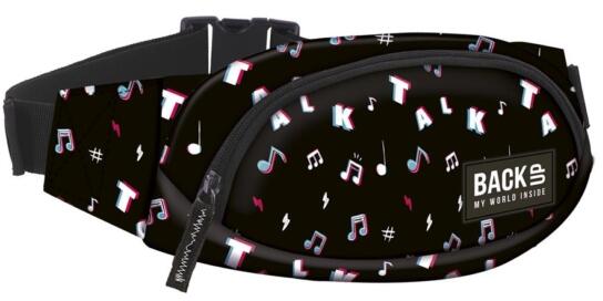 A BackUp övtáska - Talk színes hangjegyekkel és feliratokkal  díszítve a nagyobb korosztály számára készült praktikus kiegészítő.  Elején egy  cipzáras rekesz, hátoldalán pedig egy kisebb cipzáras zseb  található, melyekben kényelmesen el tudod rendezni holmidat. Az állítható vállpánt nak és a nagyméretű, könnyen kezelhető csatnak köszönhetően többféle képen is hordható. Remek választás kirándulások, séták alkalmával.  A népszerű Tik Tok alkalmazás által ihletett minták kifejezetten a kiskamaszoknak készültek.