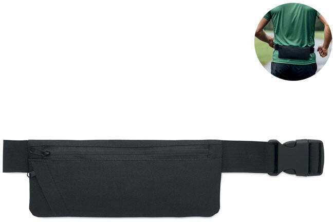 Sport futó övtáska 600D RPET poliészterből, PU bevonattal. Cipzáras fő rekesszel, cipzáras oldalsó zsebbel és állítható rugalmas pánttal. Könnyű és tartós.